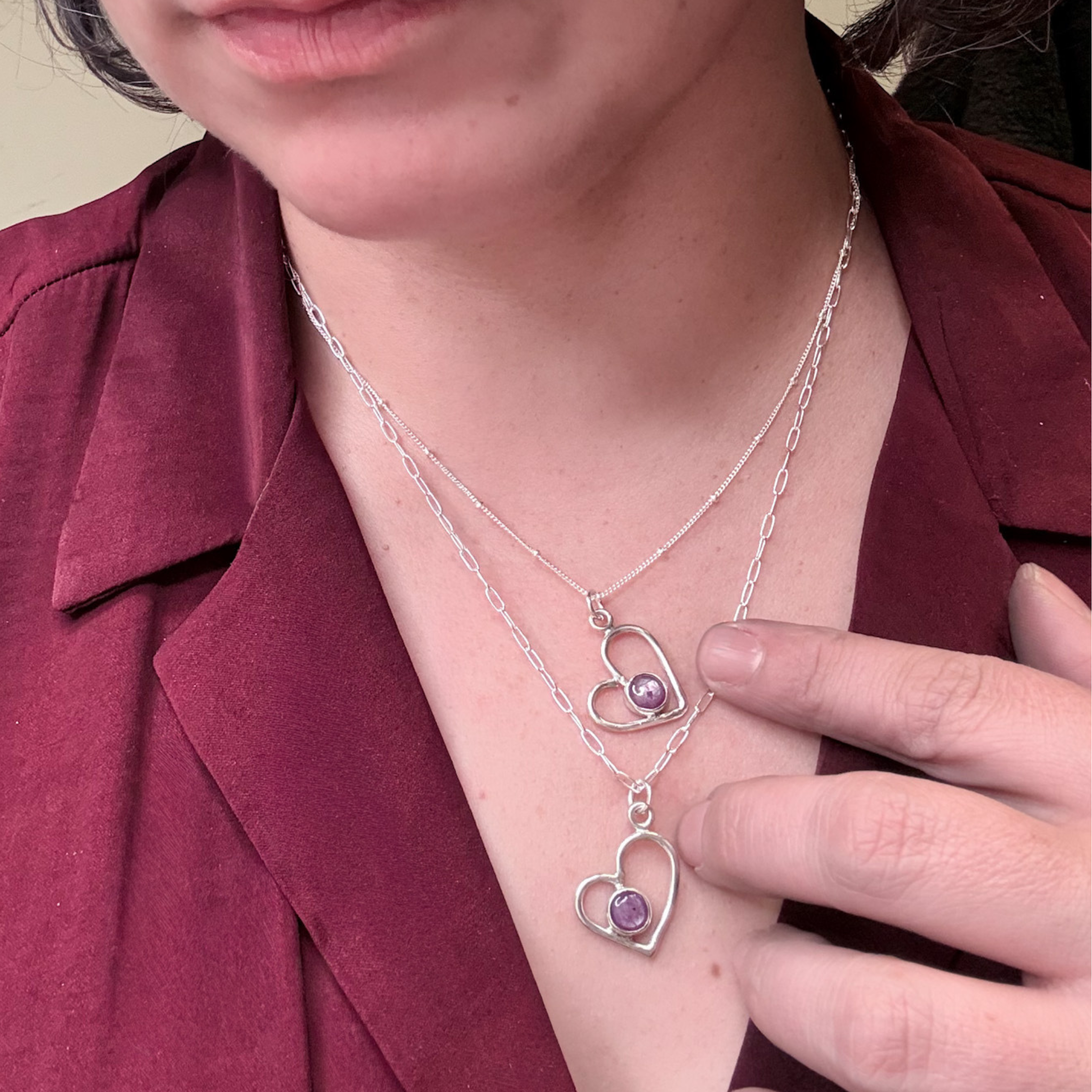 Crafted with care and intention, the Ruby Sheen Sapphire Heart Necklace captures the quiet strength of love and the beauty of transformation. Each pendant is hand-forged from solid sterling silver and set with a natural Ruby Sheen Sapphire — a rare gemstone that reflects deep magenta and silvery tones under the light.