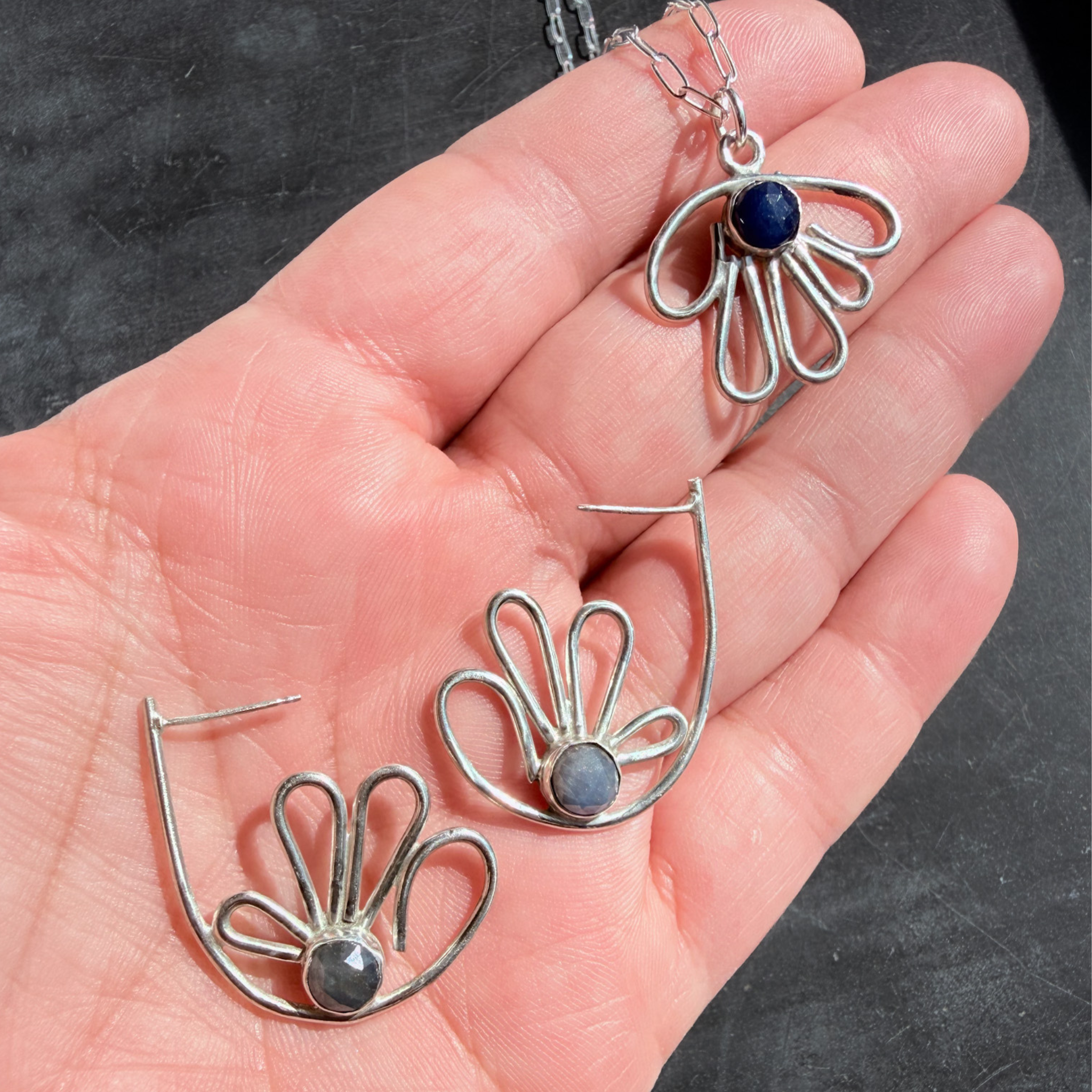 These handcrafted sterling silver earrings feature flowing organic shapes that frame a luminous faceted sapphire at the center. The open design gives them a light, airy quality while still making a statement — perfectly balancing artistry and wearability.